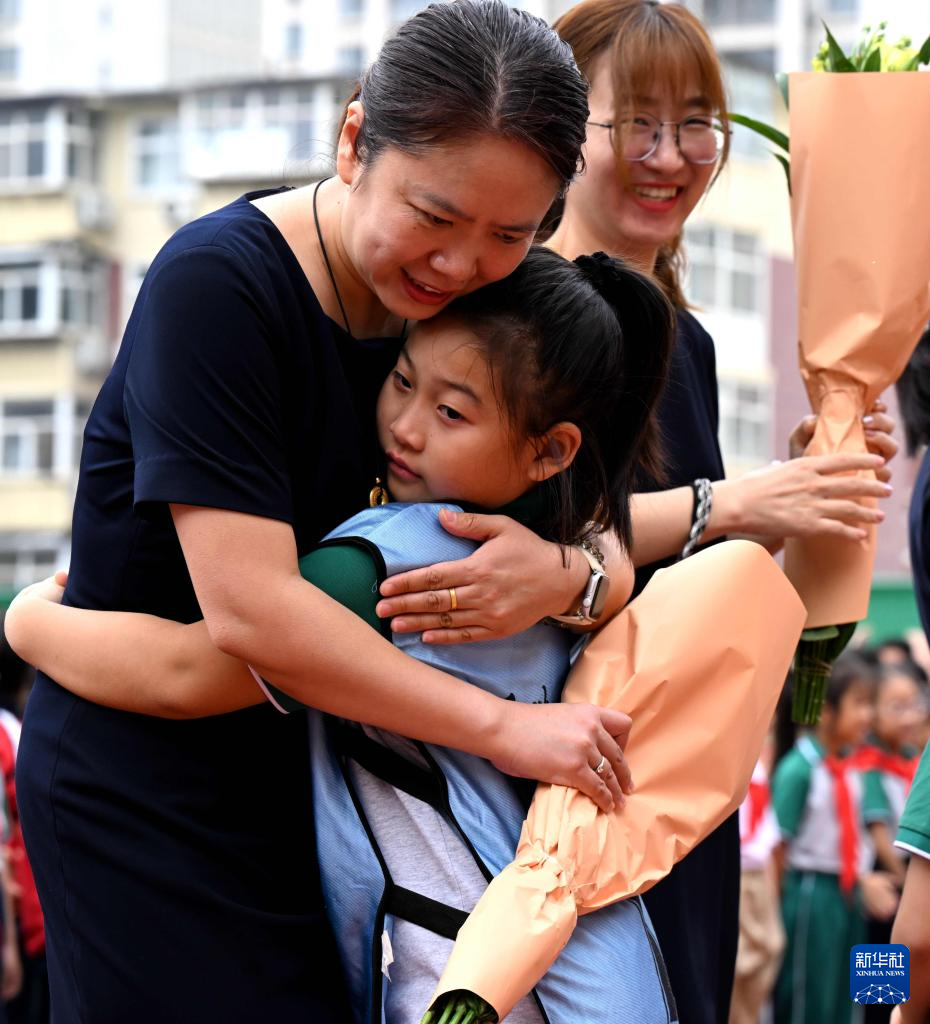 9月10日,在河北石家莊市明珠花苑小學,學生擁抱老師。
