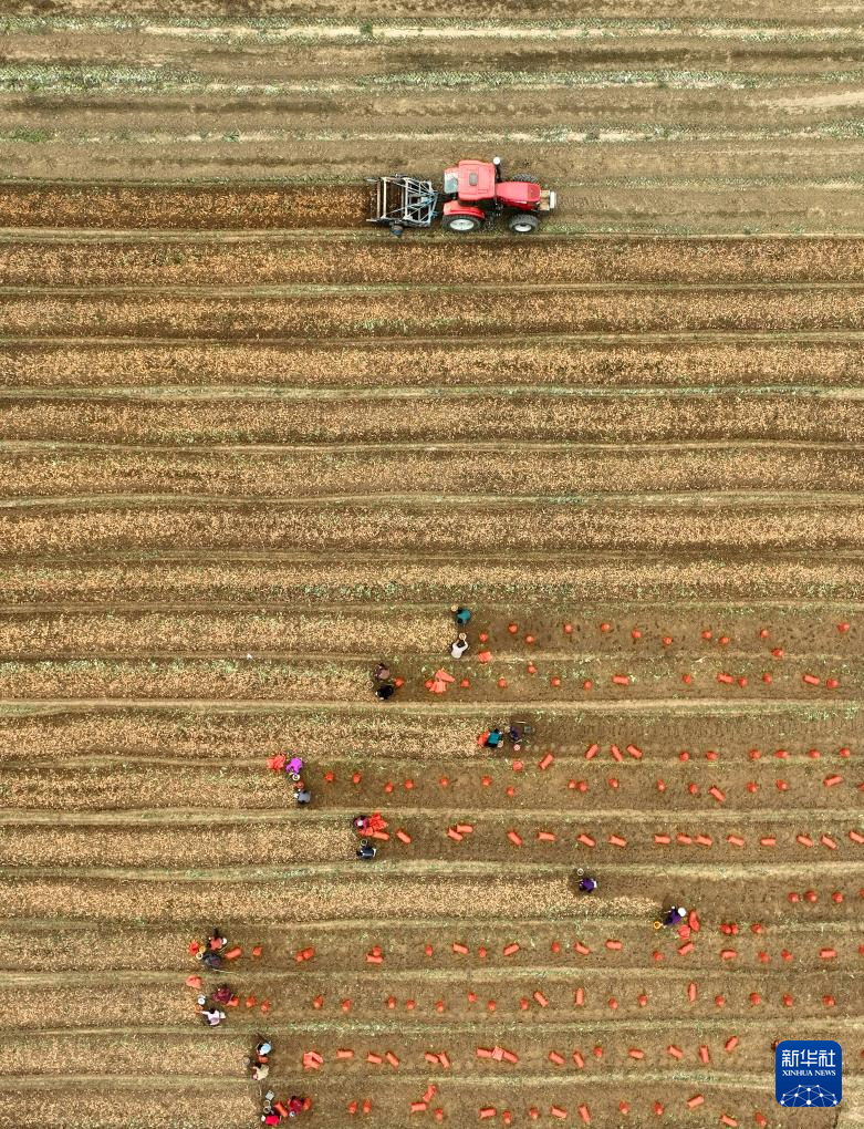 10月30日,在河南省沁陽(yáng)市王曲鄉(xiāng)東王曲村一家庭農(nóng)場(chǎng),農(nóng)民在田間收獲紅薯(無(wú)人機(jī)照片)。
