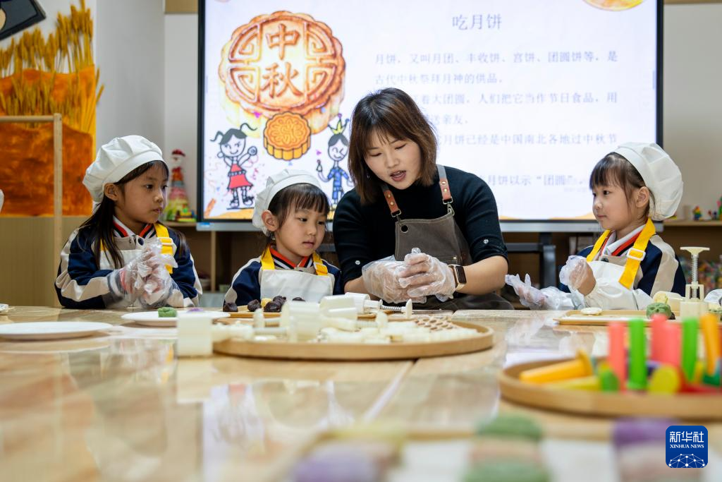 9月29日,在河南省商丘市睢縣古襄路幼兒園,小朋友們在老師的講解下學(xué)習(xí)制作冰皮月餅,了解中秋習(xí)俗。