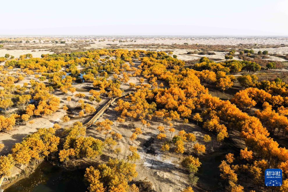 時(shí)下,新疆和田地區(qū)的胡楊迎來最佳觀賞期,成片換妝的胡楊林與水天相映,共繪金秋美景。